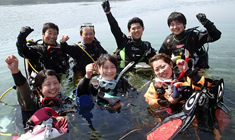 限定水域(海の浅瀬)で実際に器材をつけて練習します。 まずは安心できる深さで、しっかりとダイビングスキルをマスターすれば、海洋実習がとても楽しいものとなります。